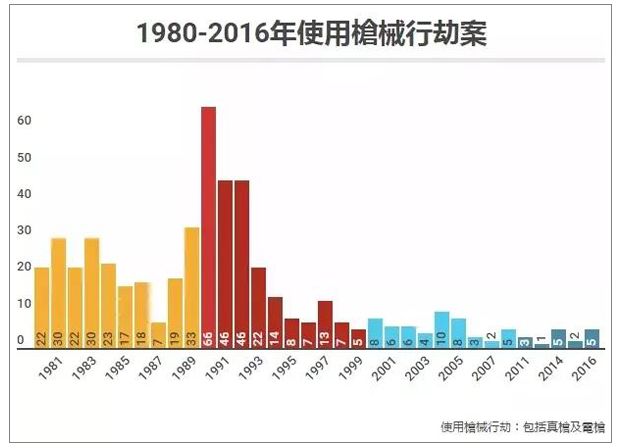 ▲香港1980年-2016年使用枪械行动案情况,数据来自远川研究。